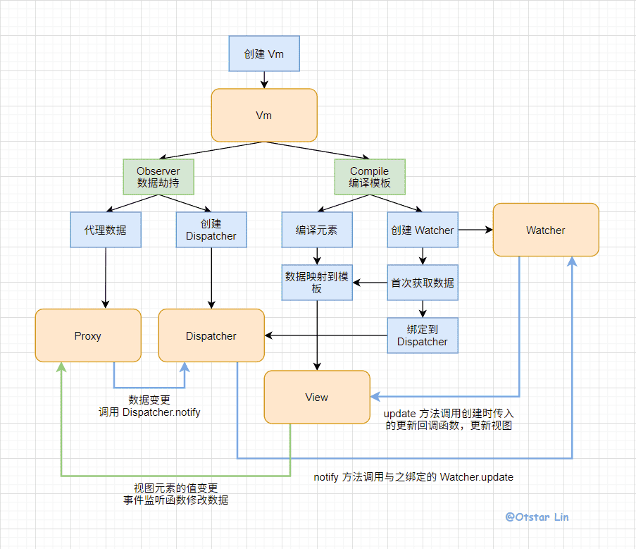 从图中可以比较清楚的看到创建 MVVM 时需要对 模板(View) 进行编译,对 数据(Model) 进行劫持,然后创建 监听器(Watcher) 以及 发布器(Dispatcher),最后将 Watcher 绑定到 Dispatcher 上即可完成 Model 绑定 View,对于可以修改的 View 元素,如 input,则需要同时创建一个更新事件,当可修改的元素发生改变后则直接修改 Model 中的数据,此时就完成了 View 绑定 Model。