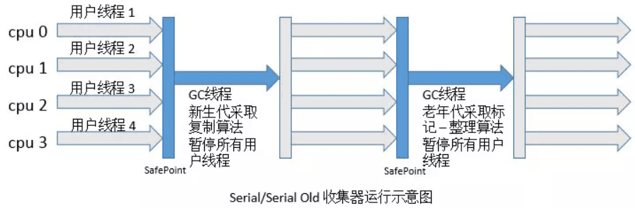 - Serial,用于新生代,采用标记-复制算法,回收时采用单线程的方式,进行垃圾收集的时候需要暂停其他线程(STW)。 一般用于 Client 端的 JVM。